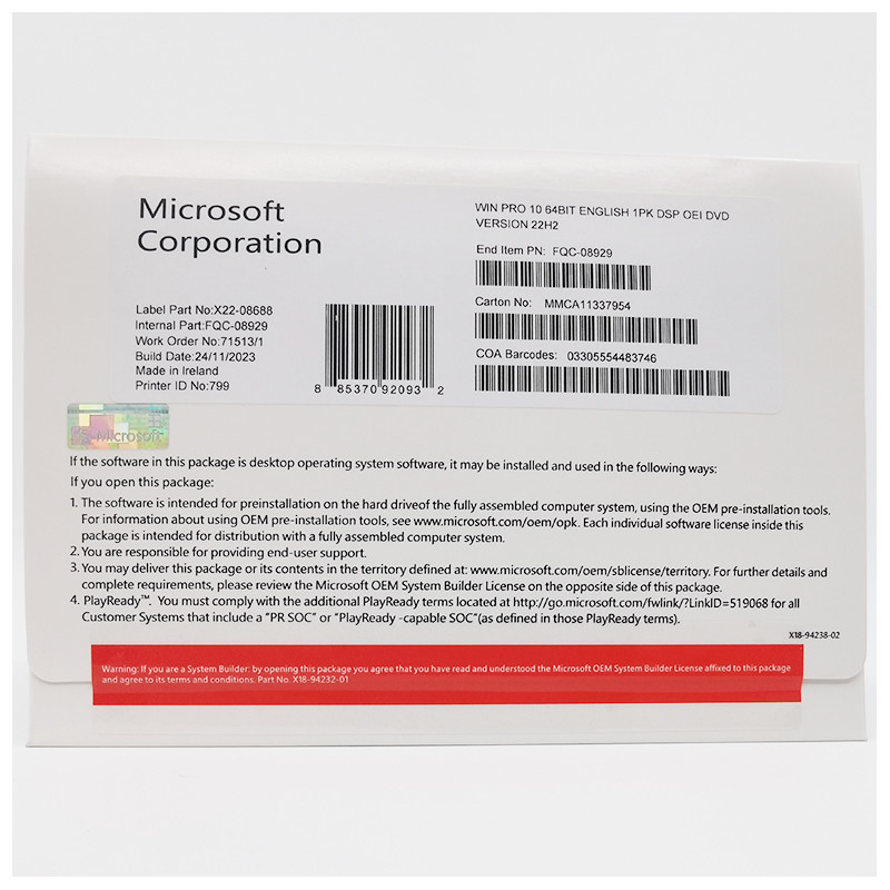 Το πακέτο Windows 10 Professional OEM περιλαμβάνει ένα DVD για εύκολη εγκατάσταση και ένα αυτοκόλλητο κλειδί που μπορείτε να χρησιμοποιήσετε για να ενεργοποιήσετε το αντίγραφό σας του λειτουργικού συστήματος.Αυτό εξασφαλίζει ότι έχετε όλα όσα χρειάζεστε για να ξεκινήσετε με τα Windows 10 Pro αμέσως από το κουτί, καθιστώντας την διαδικασία εγκατάστασης γρήγορη και χωρίς προβλήματα.