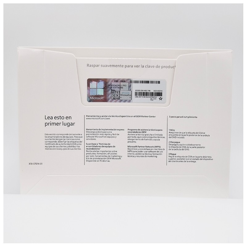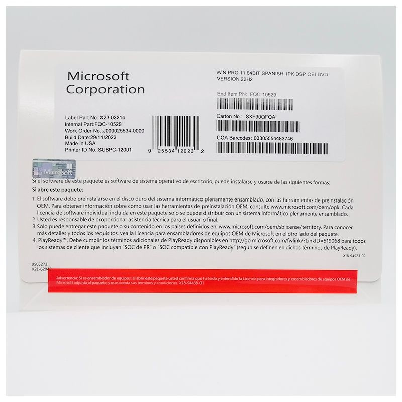 Το Windows 11 Pro OEM με υποστήριξη ισπανικής γλώσσας είναι η ιδανική επιλογή για ισπανόφωνους χρήστες, επιχειρήσεις που δραστηριοποιούνται σε ισπανικές αγορές ή κατασκευαστές συστημάτων που δημιουργούν υπολογιστές για ισπανόφωνους πελάτες. Αυτή η έκδοση παρέχει όλα τα επαγγελματικά χαρακτηριστικά των Windows 11 με μια πλήρως τοπικοποιημένη ισπανική εμπειρία σε πιο προσιτή τιμή από τις εκδόσεις λιανικής.